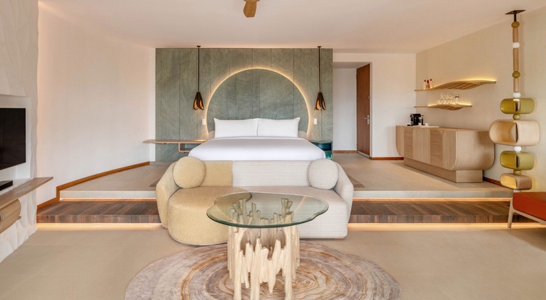 Погружение в волшебный мир острова начинается с эффектного причала Arrival Jetty, удивляющего своей архитектурой. Здесь же, в укромном месте, расположен секретный бар с захватывающим видом на домашний риф. Обновленная зона Living, традиционное для бренда пространство, привлекает внимание природными текстурами и яркими акцентами, создавая непринужденную атмосферу.